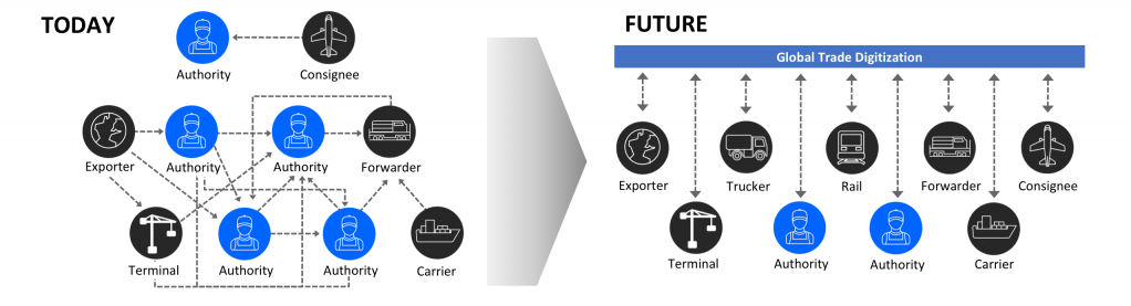 Se comprometen con la solución como consumidores de la información de embarques y capacidades de comercio internacional libre de papel.